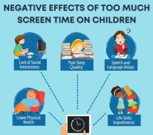 -Sleep Issues: The screen’s blue light disrupts the children’s sleep cycle, which further impacts their thinking and learning abilities.